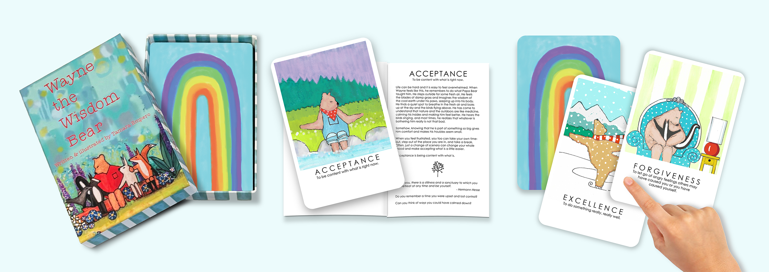 These Illustrated Cards and accompanying Story Book were created to share with the children in your life. The words are virtues, valued by faiths and cultures around the world. Join Wayne and his beloved friends Raven, Rabbit, Skunk and Fox as they live together in harmony.